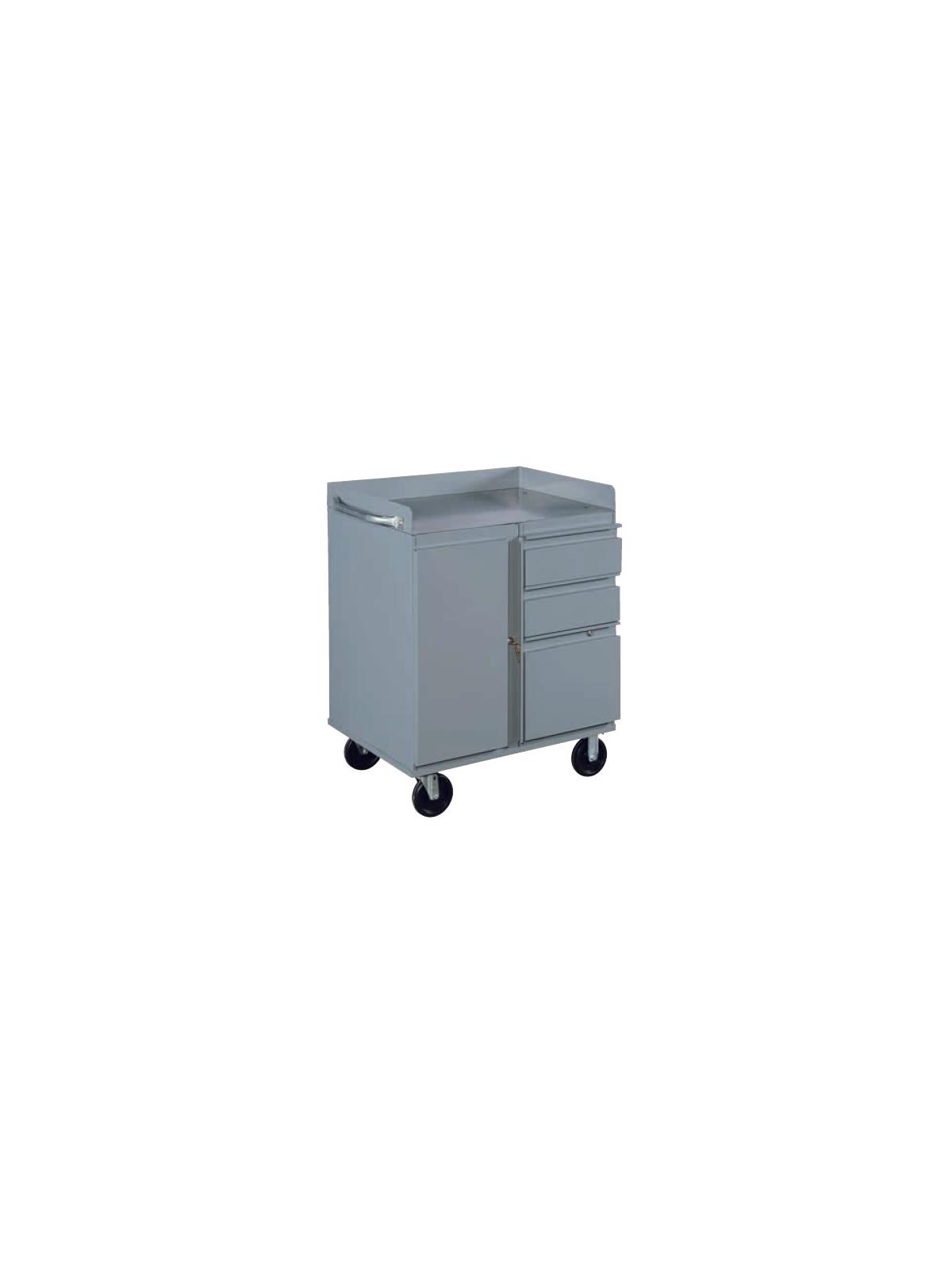 Drawers have full extension drawer slides, rated at 125 lbs. per drawer. Heavy duty 14 gauge work surface with 3" back and end stops. Heavy duty 5" casters (2 rigid, 2 swivel with brakes). Powder coated finish. Standard color is Gray. FOB Shipping Point.
