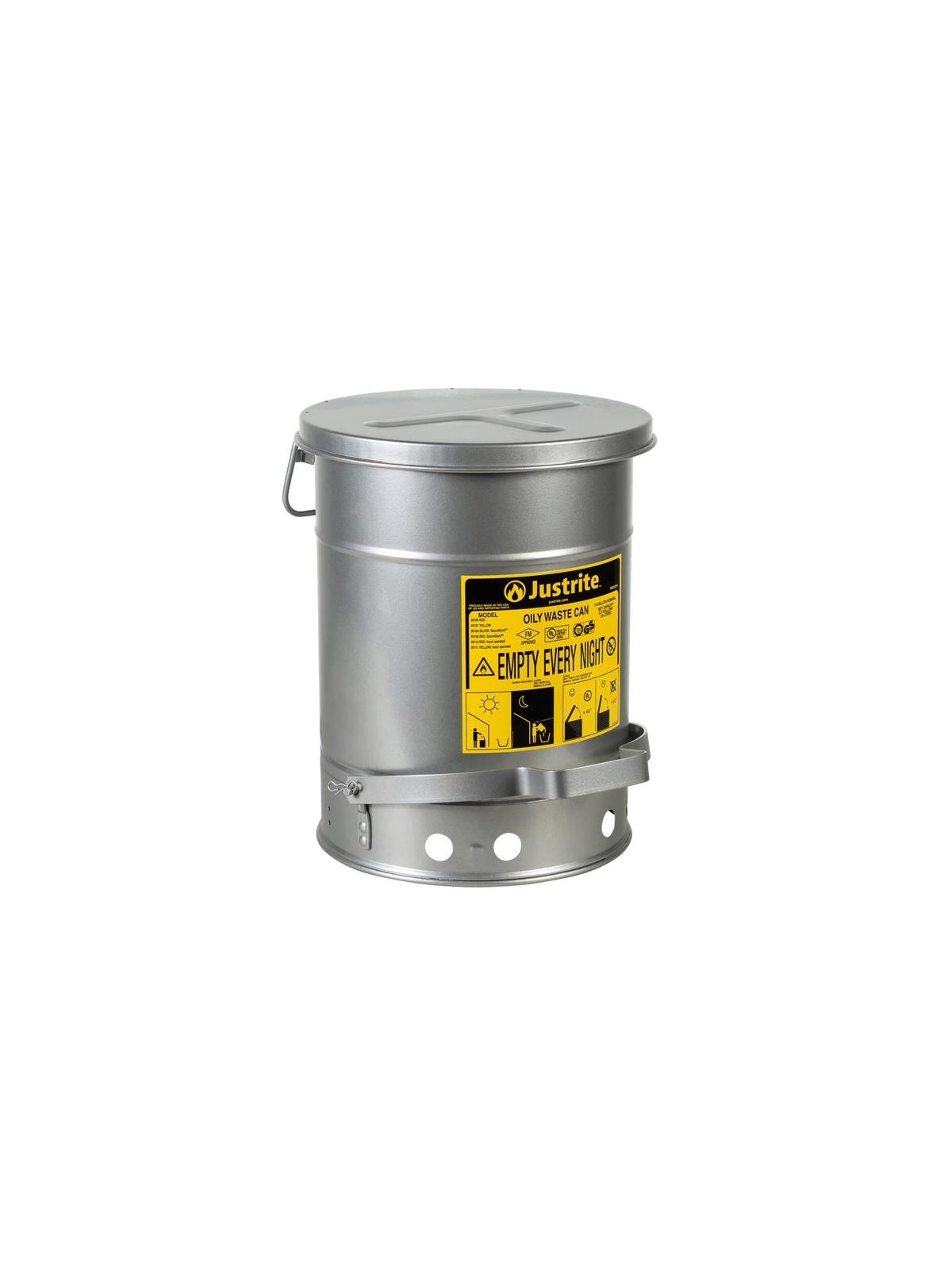 Oily Waste Cans are essential wherever solvent soaked rags and wipes are used. Durable galvanized steel body with carrying handle has a self-closing cover that stays closed when not in use to isolate contents from fire sources and limits oxygen to prevent spontaneous combustion. Raised, flow-through base encourages circulation of air to disperse heat and moisture. Silver color features SoundGard quiet-closing lid to lessen disruptive noise and provide a more comfortable working environment. OSHA compliant, FM approved. UL Listed (except for 2 gallon.) FOB Shipping Point.