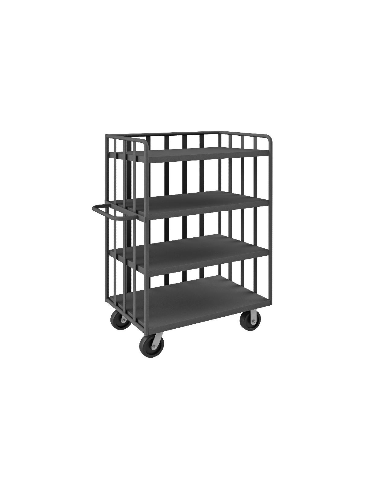 Built for heavy 2000 lb. loads. Frame is made from 1" steel tubing. 1/2" rods on sides and back. 14" clearance between shelves. Steel shelves slope 1" from front to rear preventing contents from falling off during transport Shelves are made of 14 ga. steel. Smooth rolling 6" x 2" phenolic bolt-on casters, 2 swivel, 2 rigid. All units are 58"H. Gray powder coat finish. FOB Shipping Point.