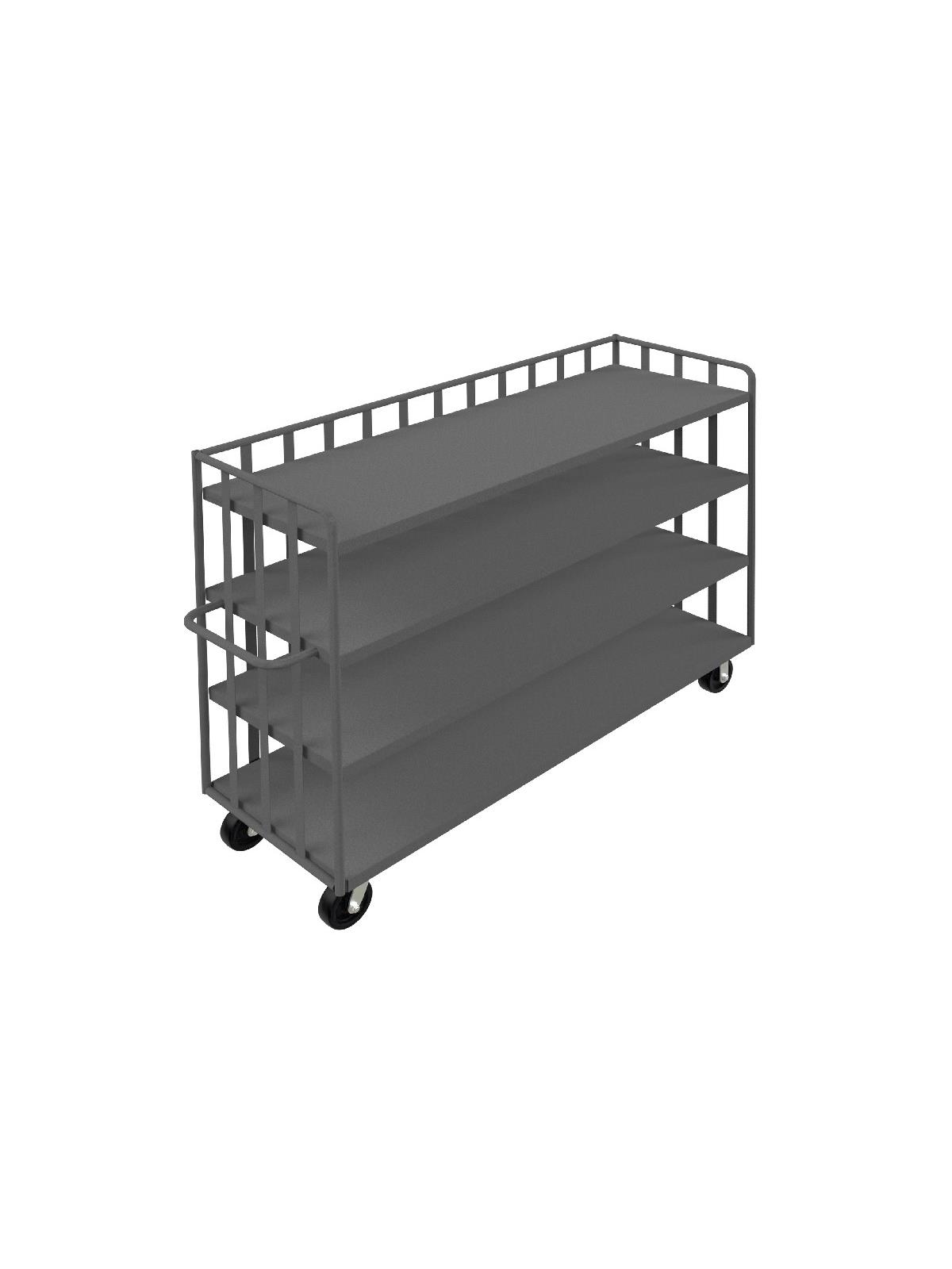Built for heavy 2000 lb. loads. Frame is made from 1" steel tubing. 1/2" rods on sides and back. 14" clearance between shelves. Steel shelves slope 1" from front to rear preventing contents from falling off during transport Shelves are made of 14 ga. steel. Smooth rolling 6" x 2" phenolic bolt-on casters, 2 swivel, 2 rigid. All units are 58"H. Gray powder coat finish. FOB Shipping Point.