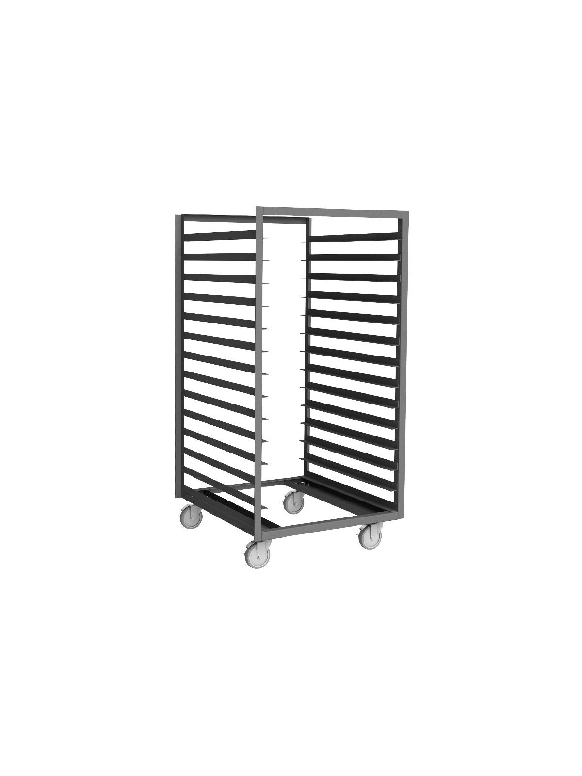 Constructed of 1-1/2" x 1/8" angle iron. Rolls of 5" x 1-1/4" bolt-on polyurethane casters, (4) swivel with side brakes. Trucks ship fully assembled. Trays slide easily into place. Durable, gray, textured powder coat finish. FOB Shipping Point.