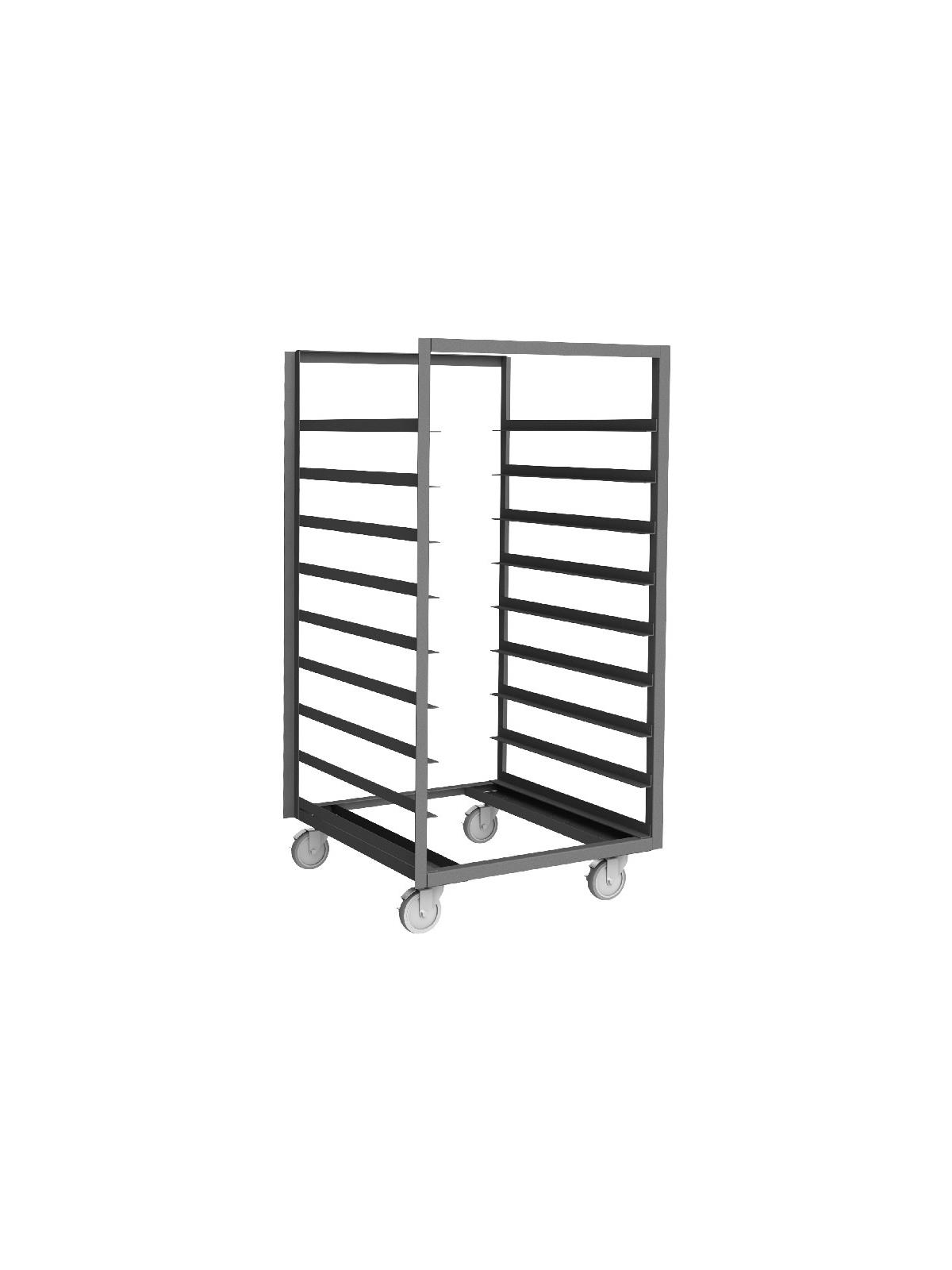 Constructed of 1-1/2" x 1/8" angle iron. Rolls of 5" x 1-1/4" bolt-on polyurethane casters, (4) swivel with side brakes. Trucks ship fully assembled. Trays slide easily into place. Durable, gray, textured powder coat finish. FOB Shipping Point.