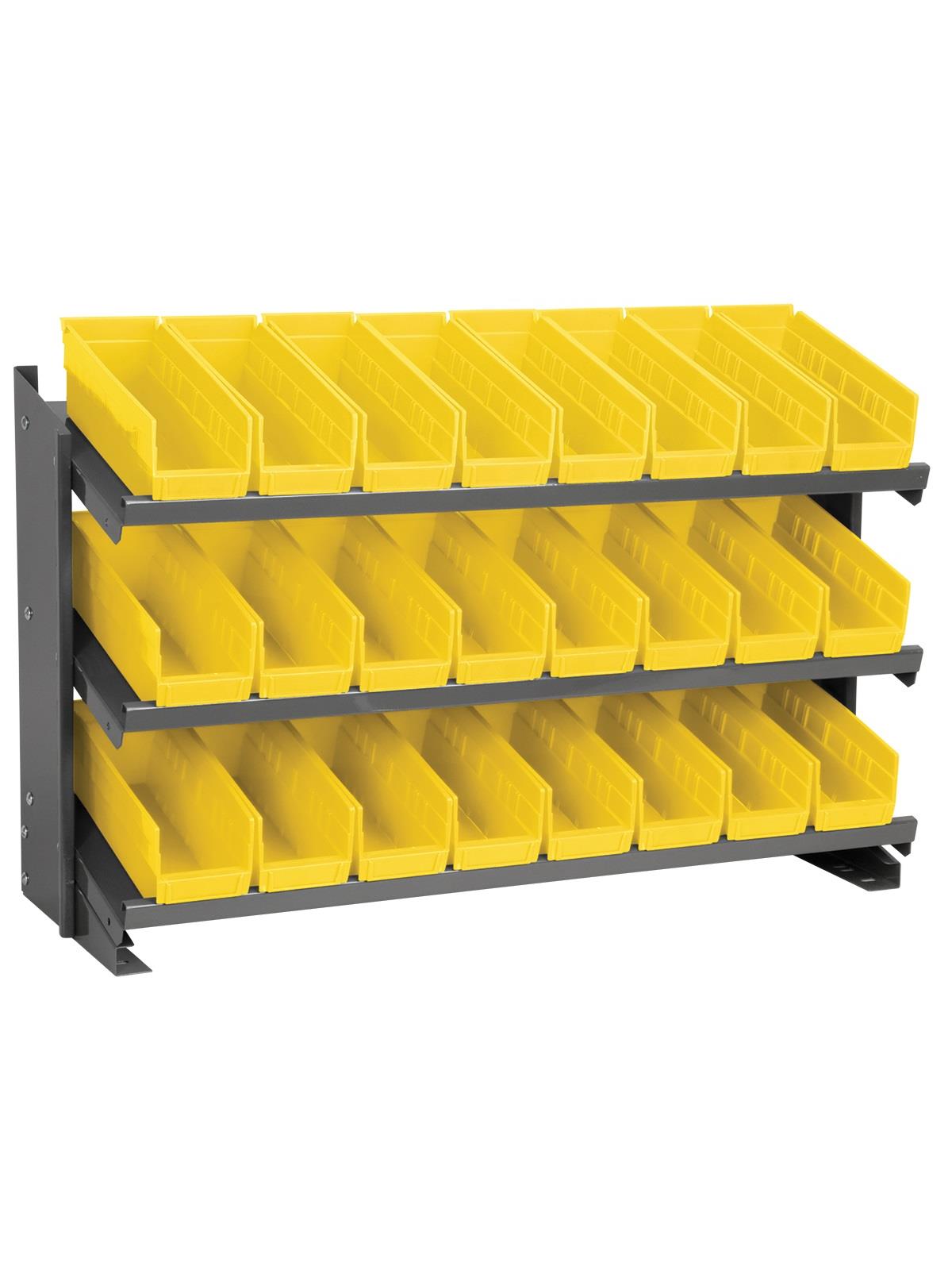 Angled shelves keep small parts in the front of the bins for easy viewing and picking. Convenient heavy-duty storage. Handsome Gray baked-enamel finish. Bins available in Red, Yellow, Blue, Green, or Semi-Clear. FOB Shipping Point.