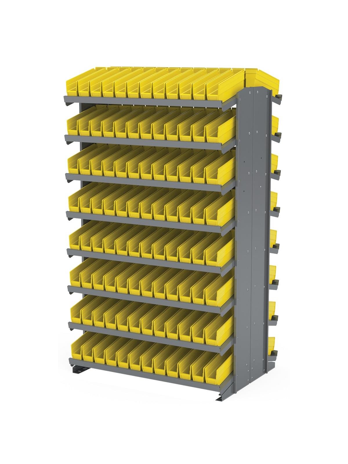 Angled shelves keep small parts in the front of the bins for easy viewing and picking. Convenient heavy-duty storage. Handsome Gray baked-enamel finish. Bins available in Red, Yellow, Blue, Green, or Semi-Clear. FOB Shipping Point.