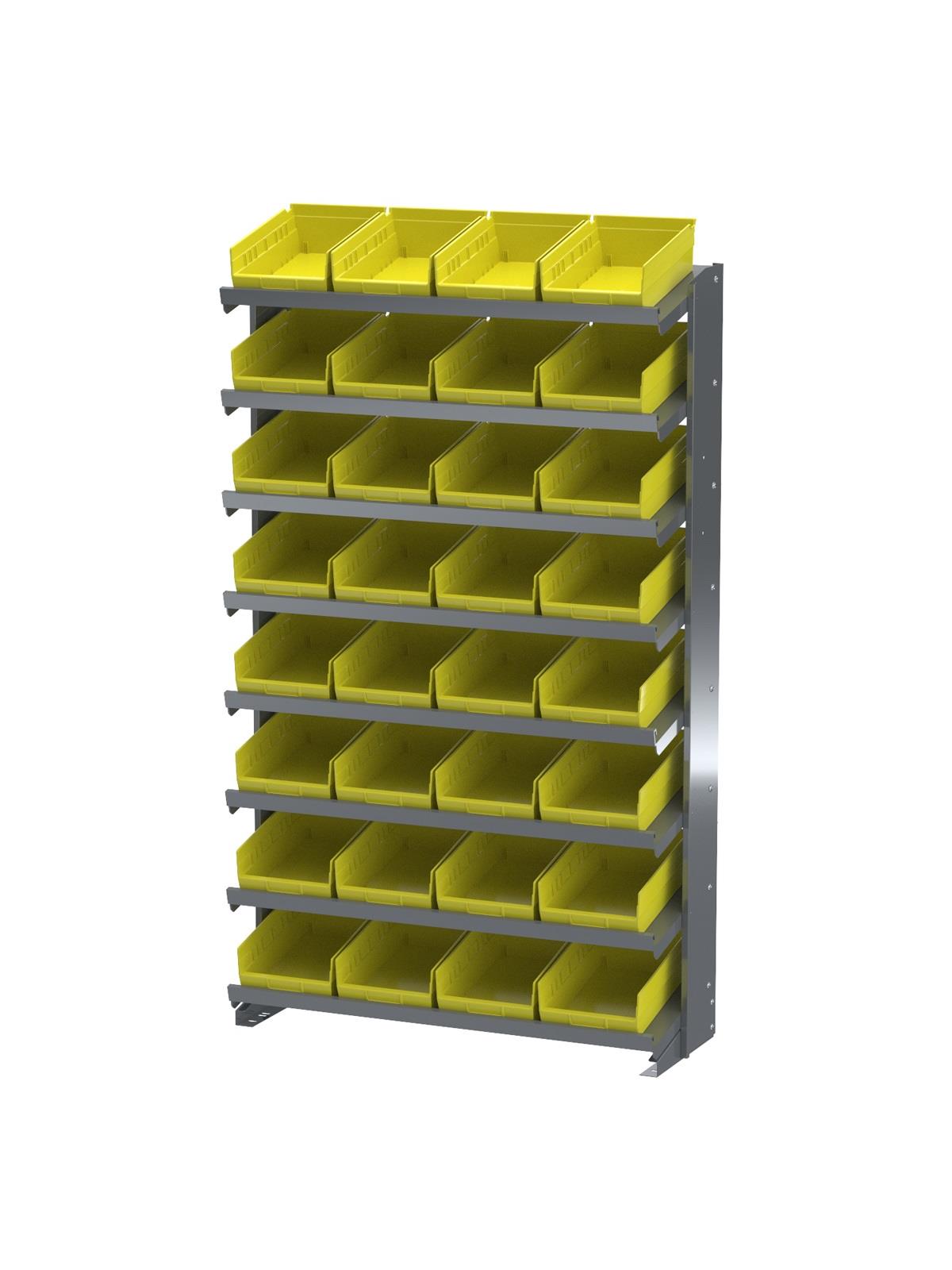Angled shelves keep small parts in the front of the bins for easy viewing and picking. Convenient heavy-duty storage. Handsome Gray baked-enamel finish. Bins available in Red, Yellow, Blue, Green, or Semi-Clear. FOB Shipping Point.