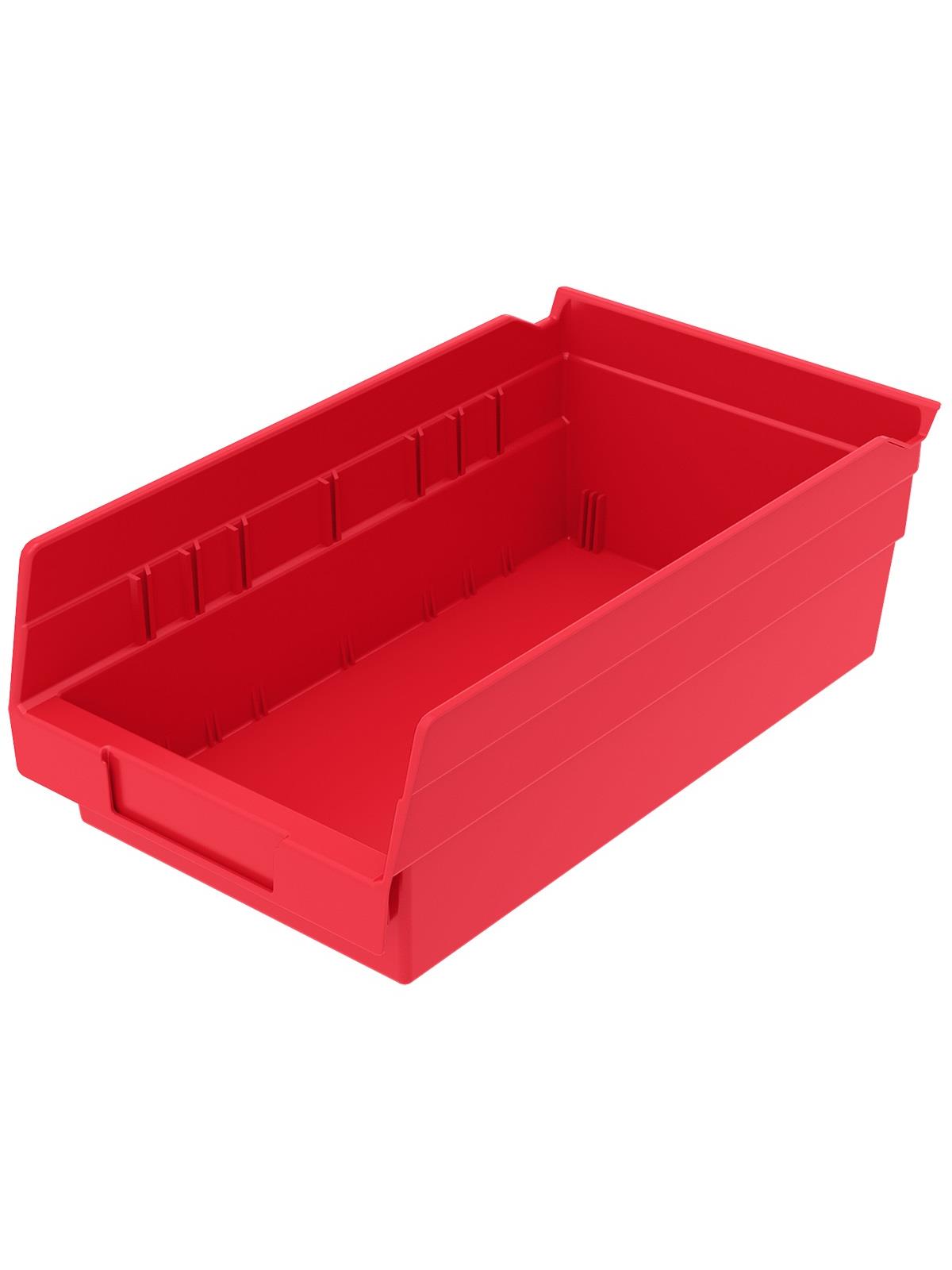 Outlasts corrugated bins - pays for themselves in reduced replacement costs. One-piece construction is waterproof and unaffected by grease or oil. Works with 12", 18" and 24" deep shelving, or vertical storage and retrieval units. Labels available. Available in 22 sizes and five colors - Red, Yellow, Blue, Green, or Semi-Clear. FOB Shipping Point.