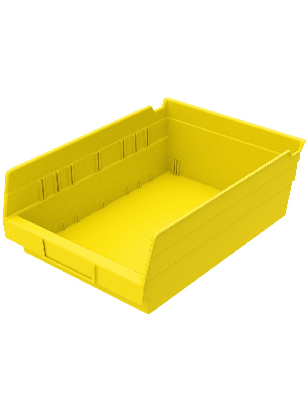 Outlasts corrugated bins - pays for themselves in reduced replacement costs. One-piece construction is waterproof and unaffected by grease or oil. Works with 12", 18" and 24" deep shelving, or vertical storage and retrieval units. Labels available. Available in 22 sizes and five colors - Red, Yellow, Blue, Green, or Semi-Clear. FOB Shipping Point.