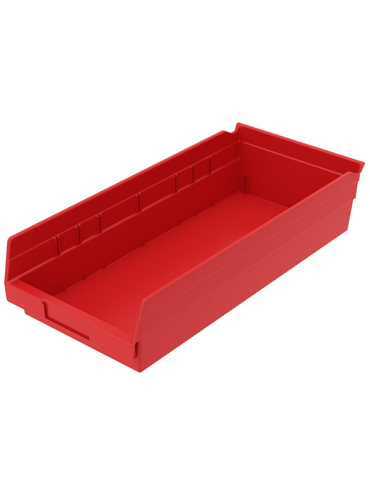 Outlasts corrugated bins - pays for themselves in reduced replacement costs. One-piece construction is waterproof and unaffected by grease or oil. Works with 12", 18" and 24" deep shelving, or vertical storage and retrieval units. Labels available. Available in 22 sizes and five colors - Red, Yellow, Blue, Green, or Semi-Clear. FOB Shipping Point.