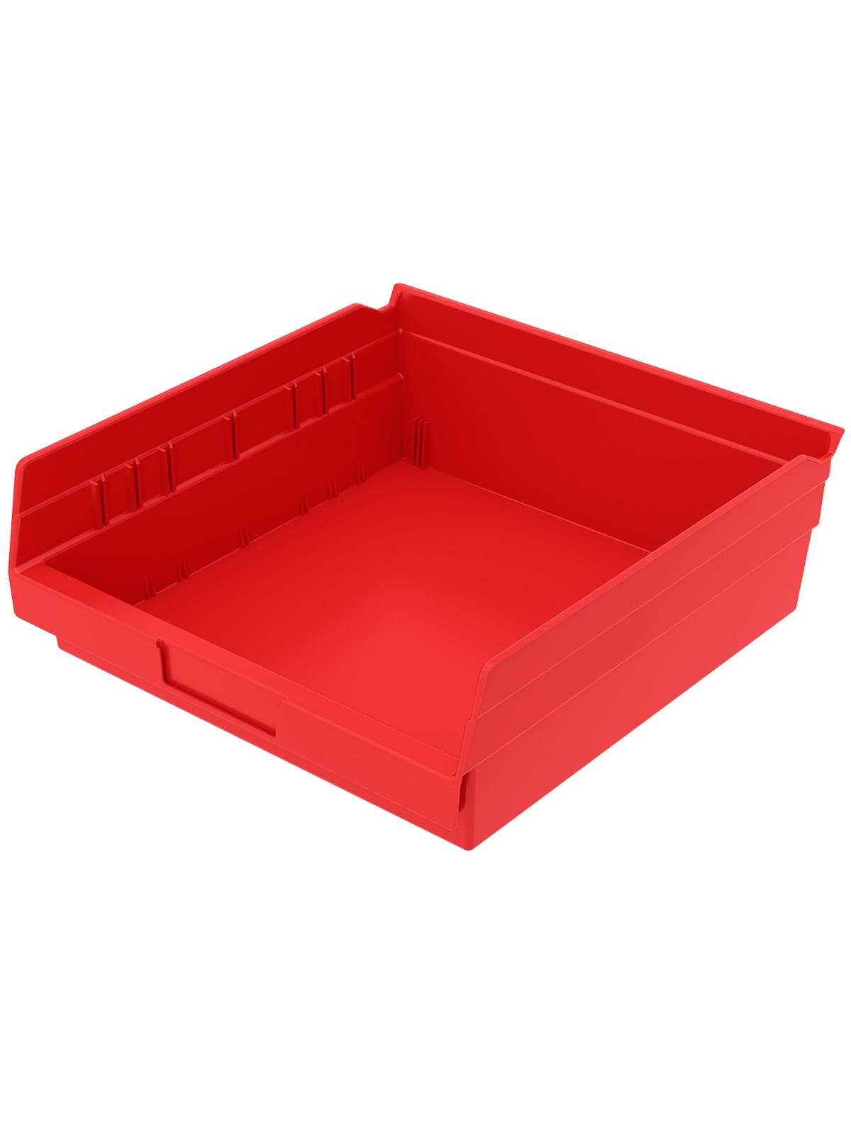 Outlasts corrugated bins - pays for themselves in reduced replacement costs. One-piece construction is waterproof and unaffected by grease or oil. Works with 12", 18" and 24" deep shelving, or vertical storage and retrieval units. Labels available. Available in 22 sizes and five colors - Red, Yellow, Blue, Green, or Semi-Clear. FOB Shipping Point.