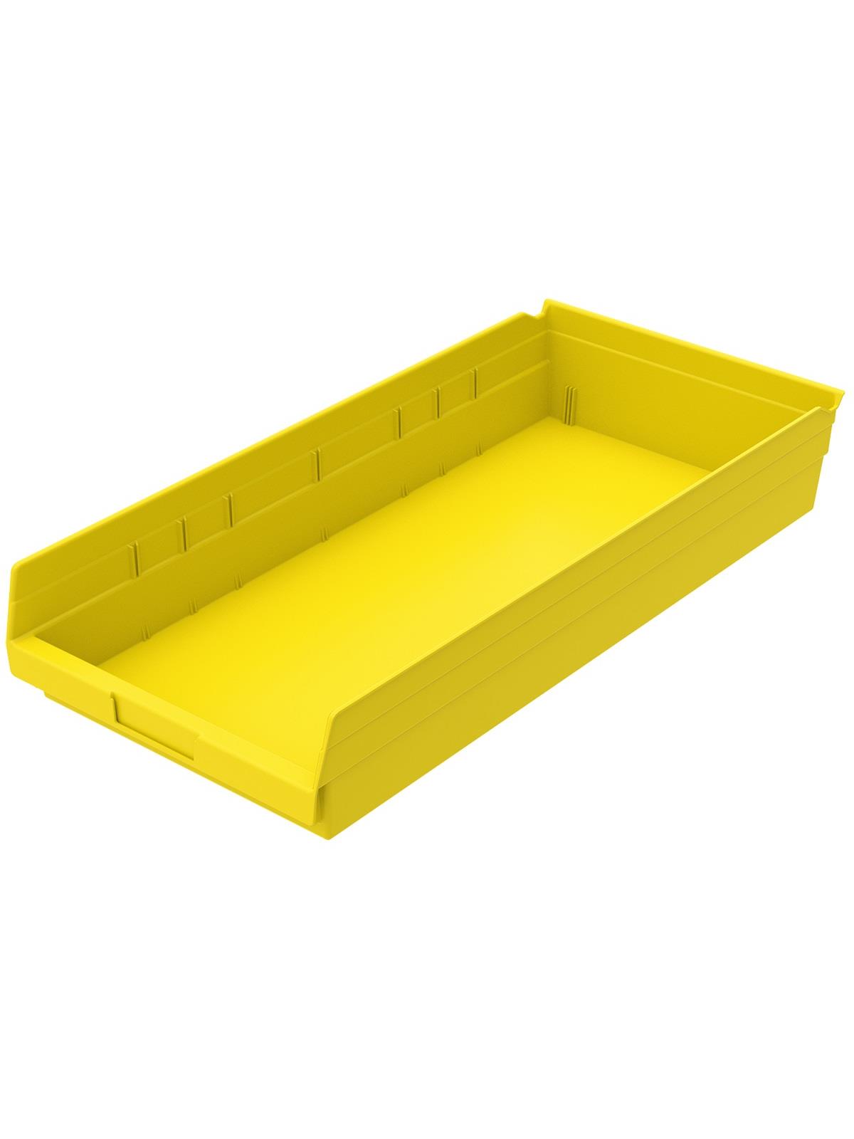 Outlasts corrugated bins - pays for themselves in reduced replacement costs. One-piece construction is waterproof and unaffected by grease or oil. Works with 12", 18" and 24" deep shelving, or vertical storage and retrieval units. Labels available. Available in 22 sizes and five colors - Red, Yellow, Blue, Green, or Semi-Clear. FOB Shipping Point.