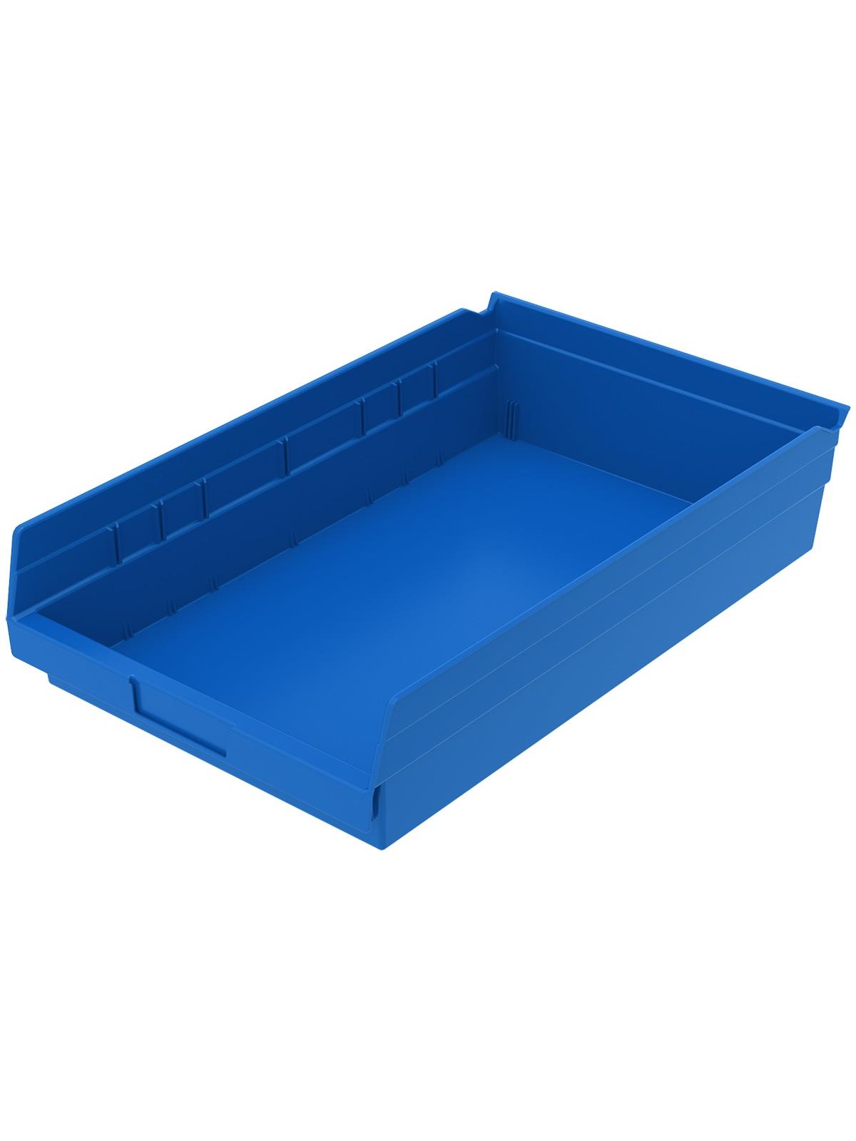 Outlasts corrugated bins - pays for themselves in reduced replacement costs. One-piece construction is waterproof and unaffected by grease or oil. Works with 12", 18" and 24" deep shelving, or vertical storage and retrieval units. Labels available. Available in 22 sizes and five colors - Red, Yellow, Blue, Green, or Semi-Clear. FOB Shipping Point.