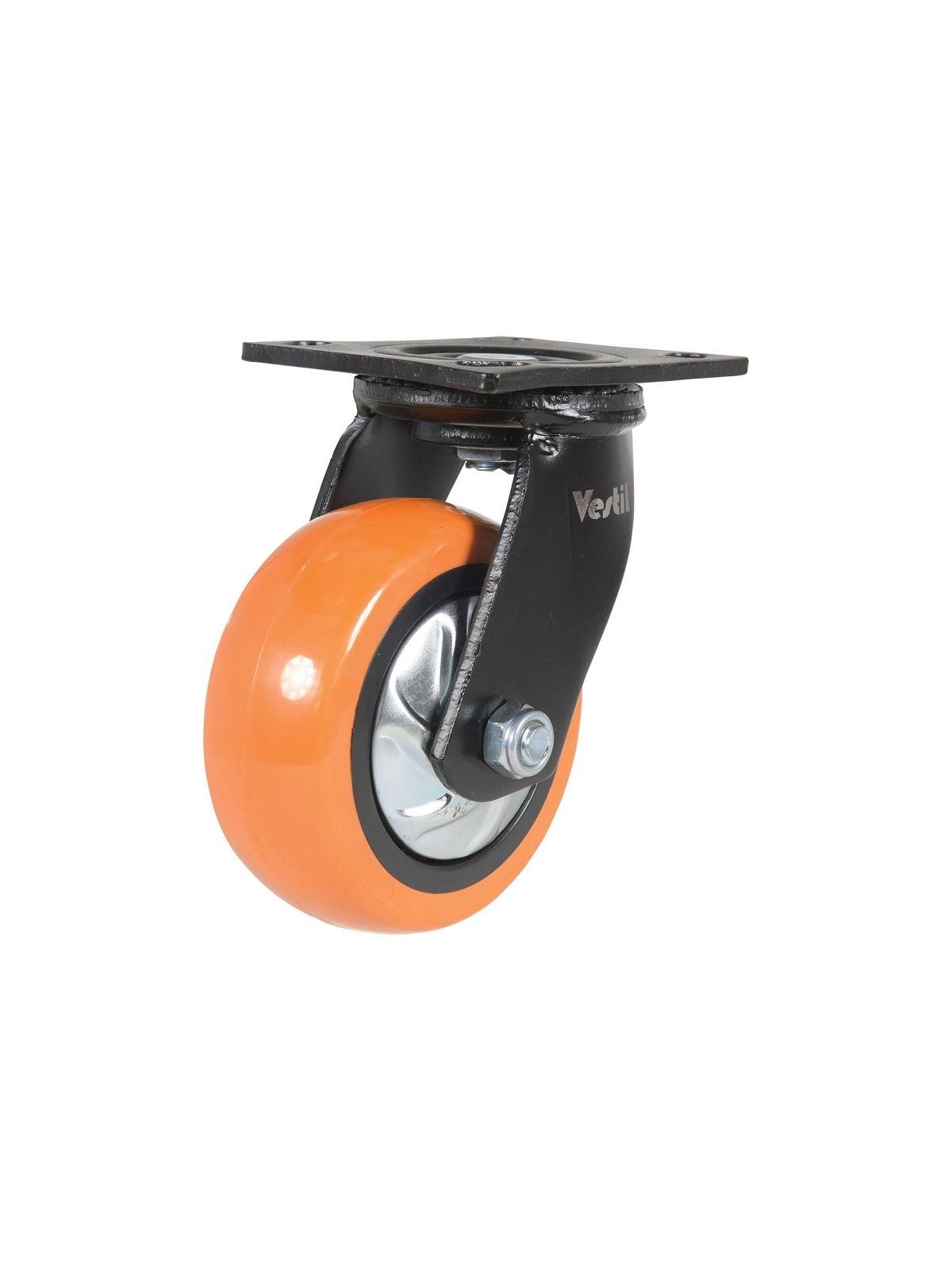 The perfect asset for an assortment of commercial and non-commercial settings. Swivel design allows the user to maneuver and change directions instantaneously. Wheel core is made of polypropylene. 95 /-5 Shore A. FOB Shipping Point.