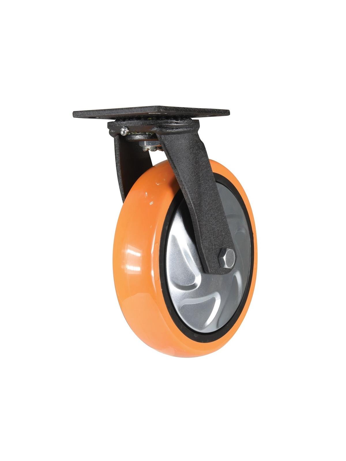 The perfect asset for an assortment of commercial and non-commercial settings. Swivel design allows the user to maneuver and change directions instantaneously. Wheel core is made of polypropylene. 95 /-5 Shore A. FOB Shipping Point.