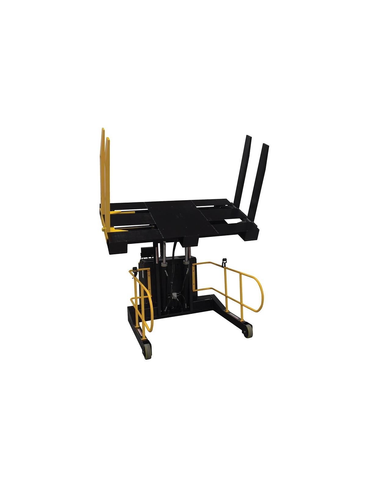 Tilt (powered) and rotate (manual) loads with our durable Pallet Inverters. Low profile design allows the operator to stand on the rider platform and steer the load from workstation to workstation quickly and easily. DC power lift and drive makes operation safe and efficient. The ergonomic handle features easy to operate throttle with infinite forward and reverse speeds, tilt/lower controls, safety belly reverse button, and horn. Features an electromagnetic disc brake with automatic dead-man feature that activates when user releases handle. Includes (4) 6V batteries, an on-board battery charger, battery level gauge, emergency battery disconnect, and horn. Ideal in loading dock areas as a powered pallet truck, powered pallet tilter, or as a manual turntable. Rolls smoothly on polyurethane steer and load wheels. FOB Shipping Point.