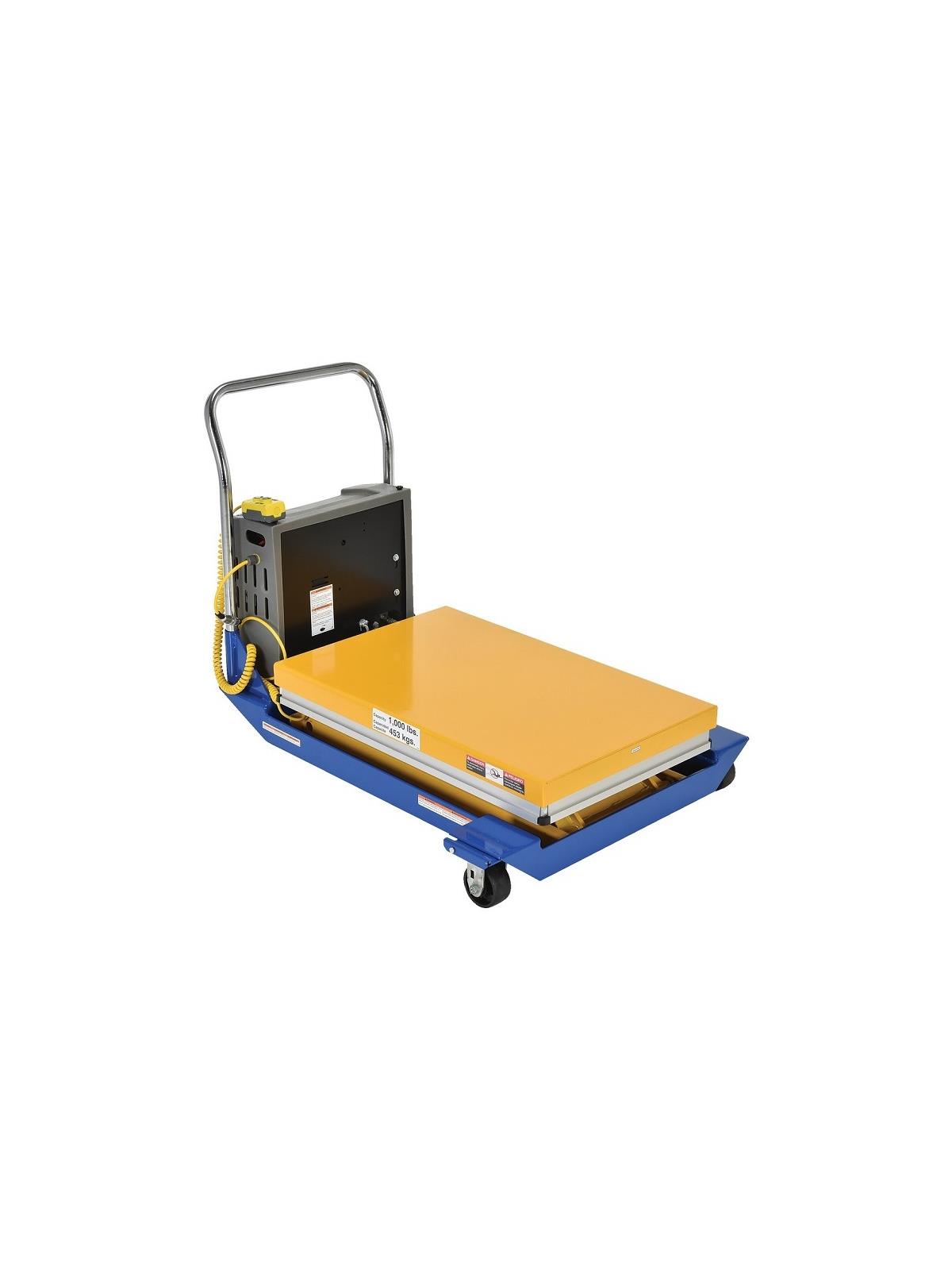 Electric motor is rated at 1600 watts. Operates on 12V DC power. Battery is 12V deep cycle for maximum life. Built-in battery charger is included (operated on 115V AC power). Includes UP and DOWN push-buttons built into power unit. Platform equipped standard with perimeter pinch-point guard for OSHA compliance. Includes 2 rigid and 2 swivel 4" x 2" phenolic casters with brakes. Push handle is removable. Includes an industry-best powder coat finish. FOB Shipping Point.