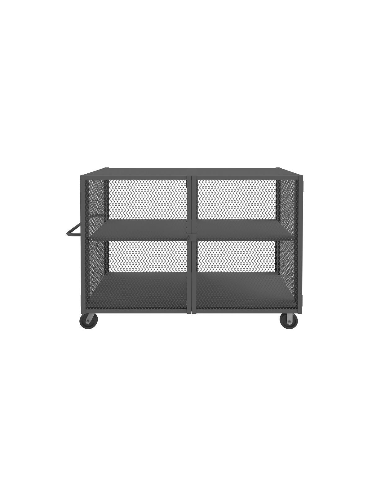 14 gauge steel construction. Punched diamond pattern on sides and front. Interior storage area is 48"H. 3-point handle has provisions for pad-lock (pad-lock not included). Rolls on 6" x 2" phenolic bolt-on casters, (2) swivel, and (2) rigid. Durable, textured gray powder coat finish. Includes one adjustable shelf. FOB Shipping Point.