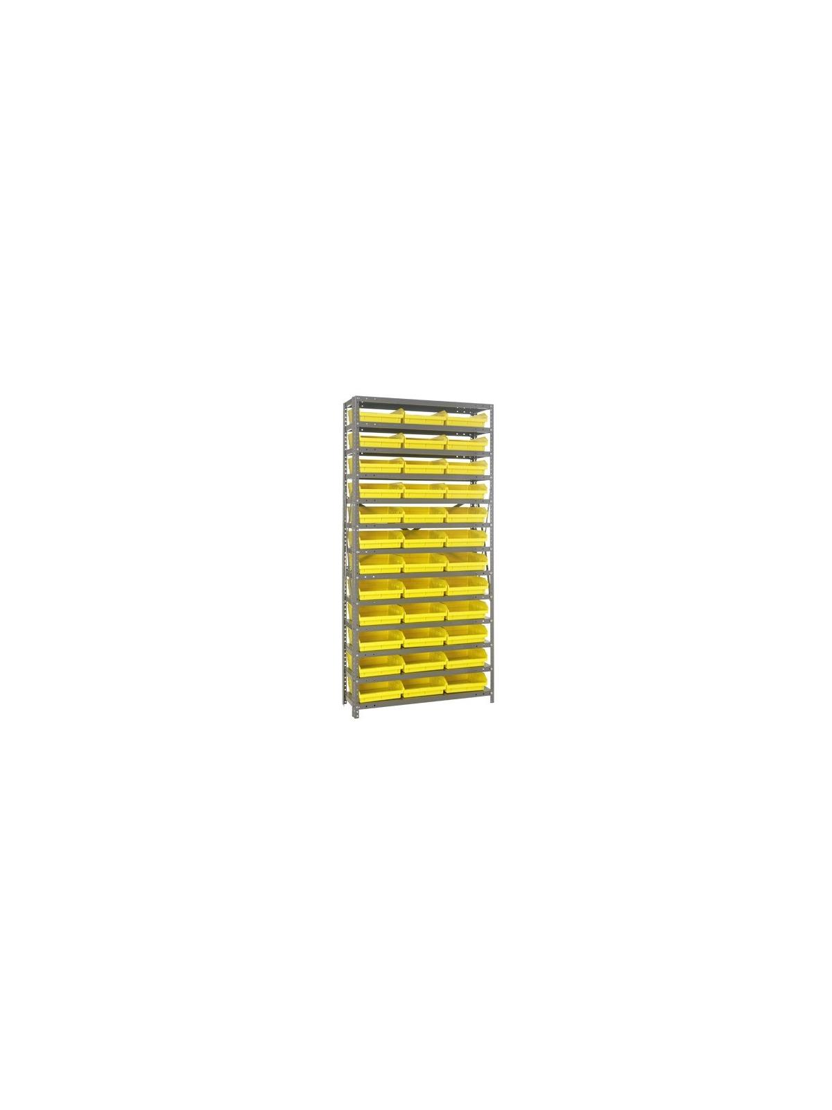 Rugged 350 lb. capacity per shelf, standard shelving unit will keep parts organized and readily accessible. Gray enamel finish will not rust or corrode. 12-HQSB100, 8-HQSB101, 5-HQSB102, 4-HQSB107, 3-HQSB109 fit across a standard 36"W x 12"D shelf. 8-HQSB103, 5-HQSB104, 4-HQSB108, 3-HQSB110 fit across a 36"W x 18"D shelf. Bins are available in Blue, Yellow, Red, Green, Ivory or Black. FOB Shipping Point.