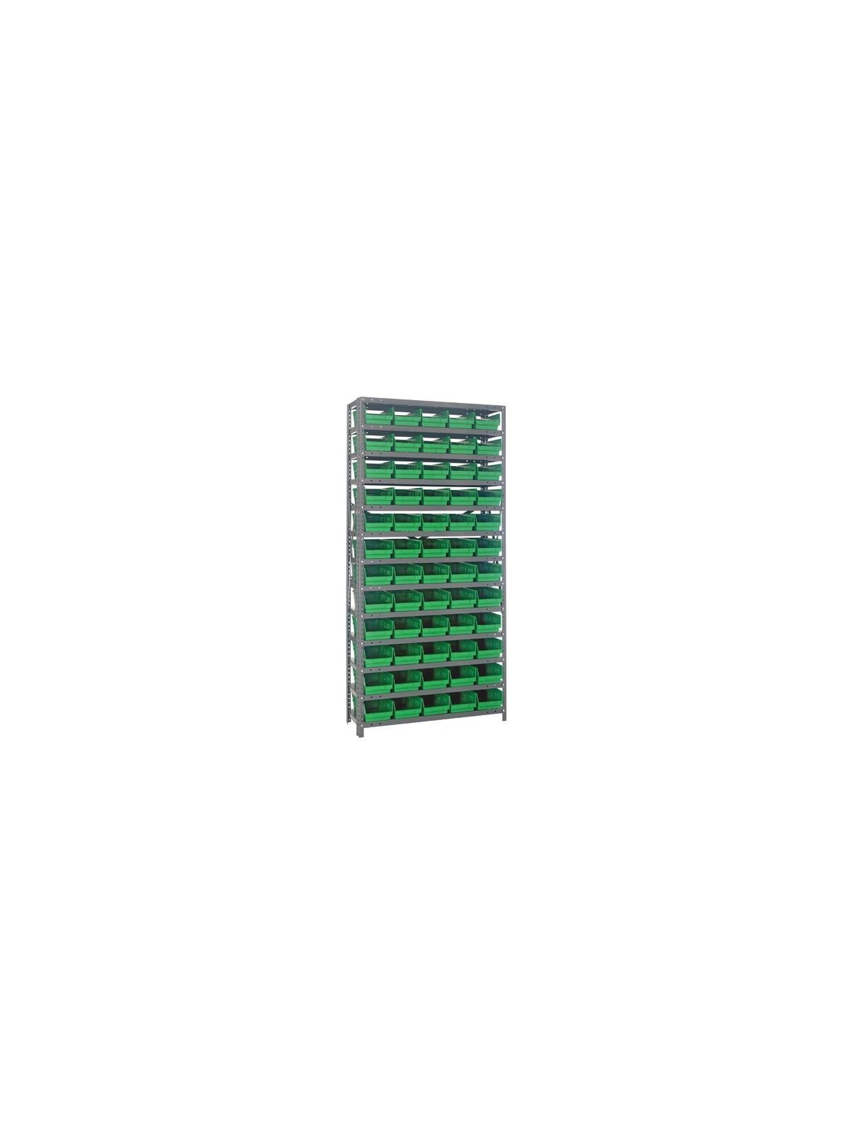 Rugged 350 lb. capacity per shelf, standard shelving unit will keep parts organized and readily accessible. Gray enamel finish will not rust or corrode. 12-HQSB100, 8-HQSB101, 5-HQSB102, 4-HQSB107, 3-HQSB109 fit across a standard 36"W x 12"D shelf. 8-HQSB103, 5-HQSB104, 4-HQSB108, 3-HQSB110 fit across a 36"W x 18"D shelf. Bins are available in Blue, Yellow, Red, Green, Ivory or Black. FOB Shipping Point.