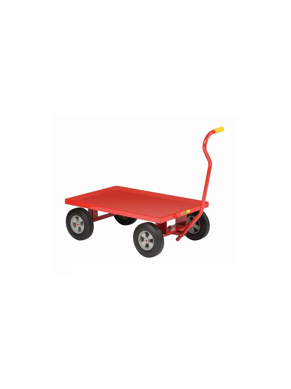 Choice of puncture proof rubber wheels, or pneumatic wheels. Pull handle has vinyl hand grip. Wagons have 1-1/2" retaining lip around the edges that help confine the load. Solid steel deck offers maximum durability. Perforated steel deck allows dirt and moisture to pass through. Deck size is 24" W x 36" L. Durable powder coat Red finish. Ships fully assembled via small package carrier. FOB Shipping Point.