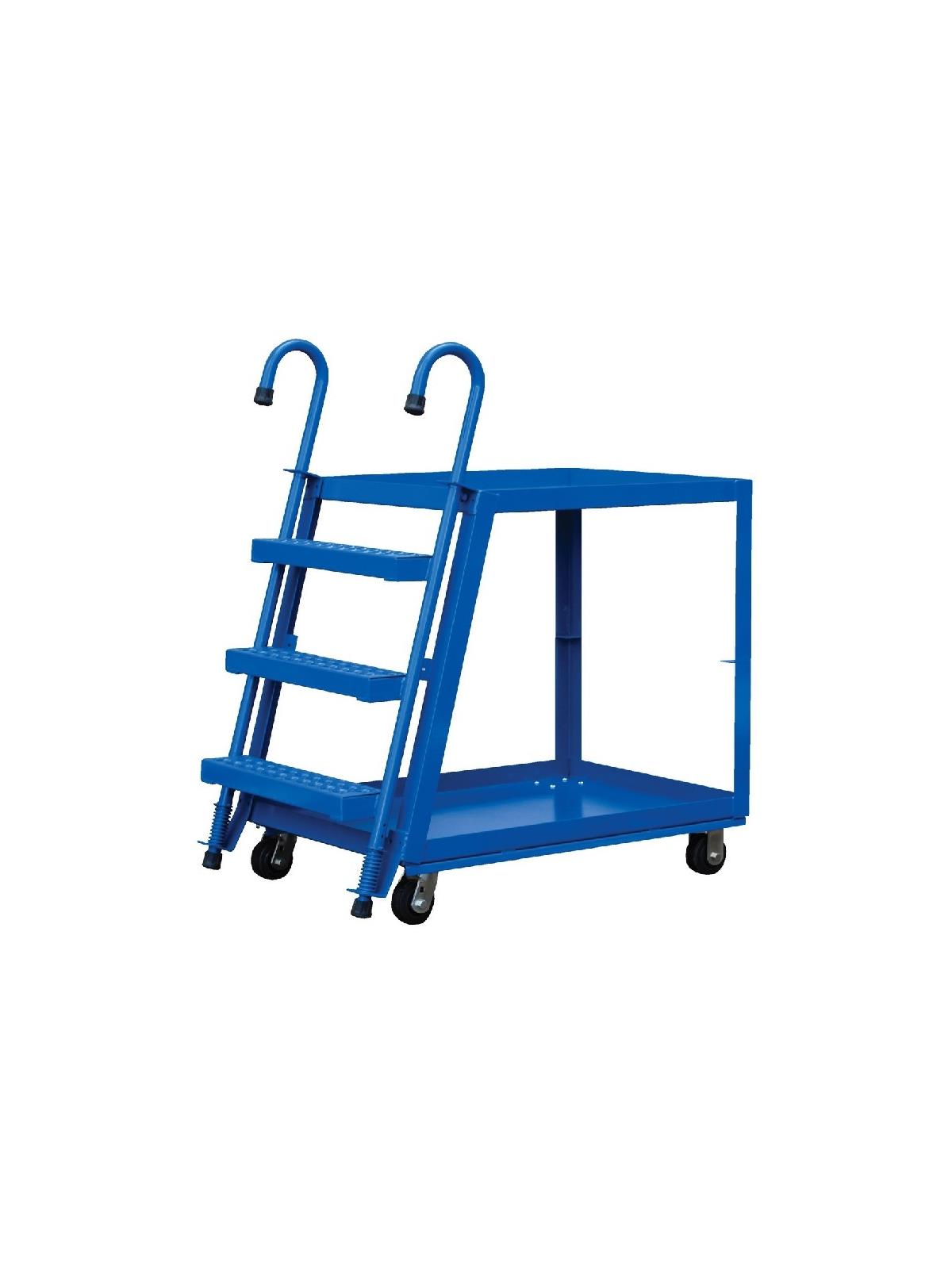 Stockpicker Trucks combine the mobility of a cart with the versatility of a steel step ladder. Spring loaded steel step ladder holds the cart securely in place while a person is standing on the ladder. Shelves have a 2" lip turned up. 4" x 1-1/2" mold-on rubber casters two (2) rigid and two (2) swivel with wheel brakes. Blue baked-in powder-coat finish for added toughness. Aluminum construction available. FOB Shipping Point.