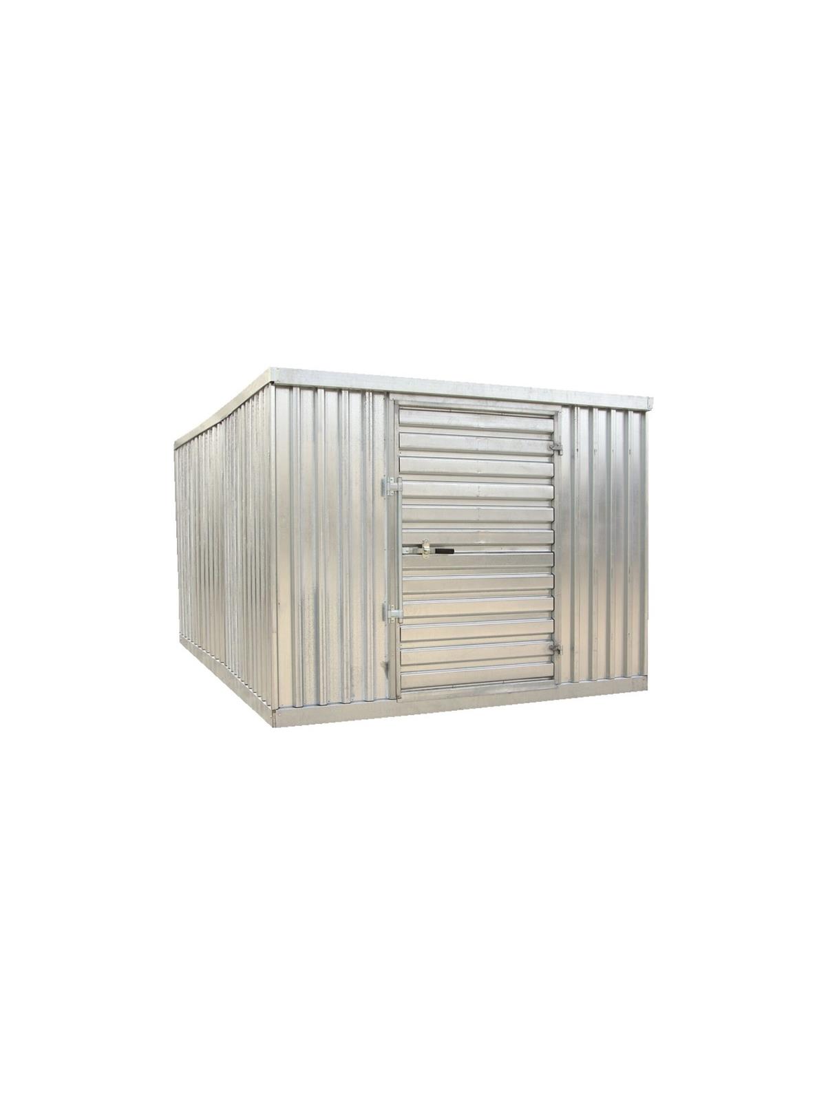 Modular Storage Buildings are ideal for keeping valuable items secure. Constructed of maintenance free galvanized corrugated paneling. The door measures 45"W x 74"H usable and features a right-side hinged lock (padlock not included). Modular design is easy to assemble. Once assembled, unit can be moved with a fork lift. Each unit features a wooden floor 5-3/4" high to help keep products dry. Built-in rain gutters for water drainage is standard. FOB Shipping Point.