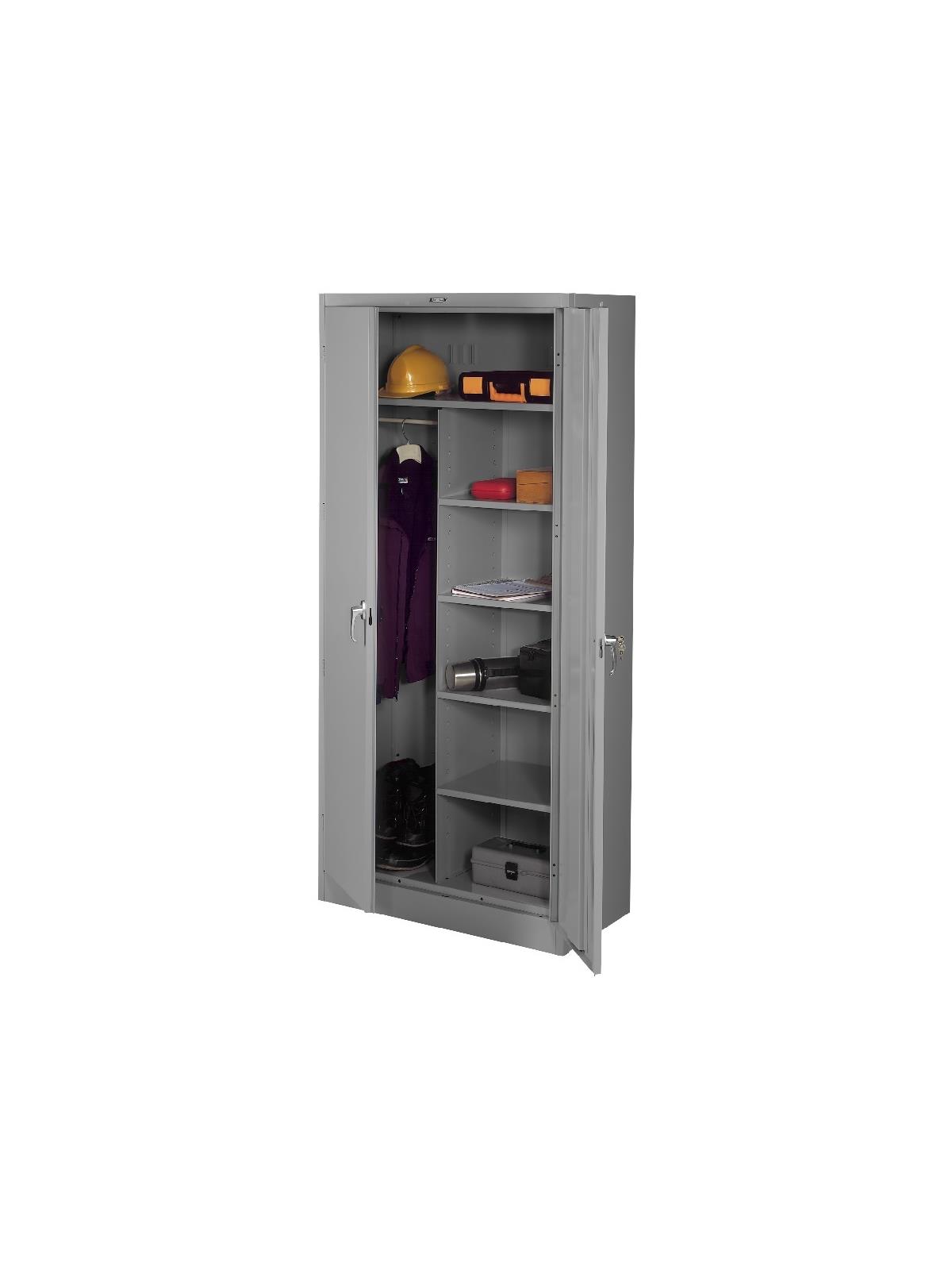 Knuckle hinges on each door insure the integrity of the cabinet and the alignment of the doors. Doors are reinforced for strength and quietness. Handle on right-hand door activates a 3-point system for added security; dummy handle on left-hand door. Shelves are adjustable in 2" increments on built-in shelf tabs. Shelves will hold up to 200 lbs. evenly distributed. Two front leveling glides compensate for uneven floors. Louvered back panel allows air circulation in the cabinet. Available in four models--storage, wardrobe, combination, and counter high cabinets. Available in Black, Champagne/Putty, Sand, Light Gray and Medium Gray. FOB Shipping Point.