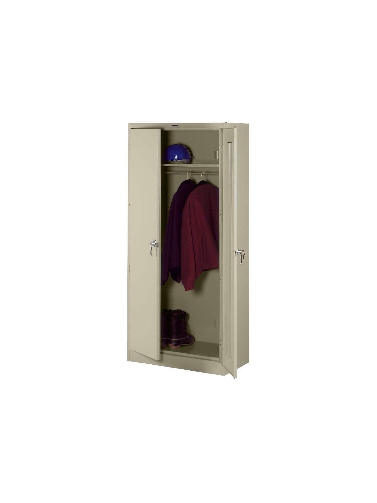 Knuckle hinges on each door insure the integrity of the cabinet and the alignment of the doors. Doors are reinforced for strength and quietness. Handle on right-hand door activates a 3-point system for added security; dummy handle on left-hand door. Shelves are adjustable in 2" increments on built-in shelf tabs. Shelves will hold up to 200 lbs. evenly distributed. Two front leveling glides compensate for uneven floors. Louvered back panel allows air circulation in the cabinet. Available in four models--storage, wardrobe, combination, and counter high cabinets. Available in Black, Champagne/Putty, Sand, Light Gray and Medium Gray. FOB Shipping Point.