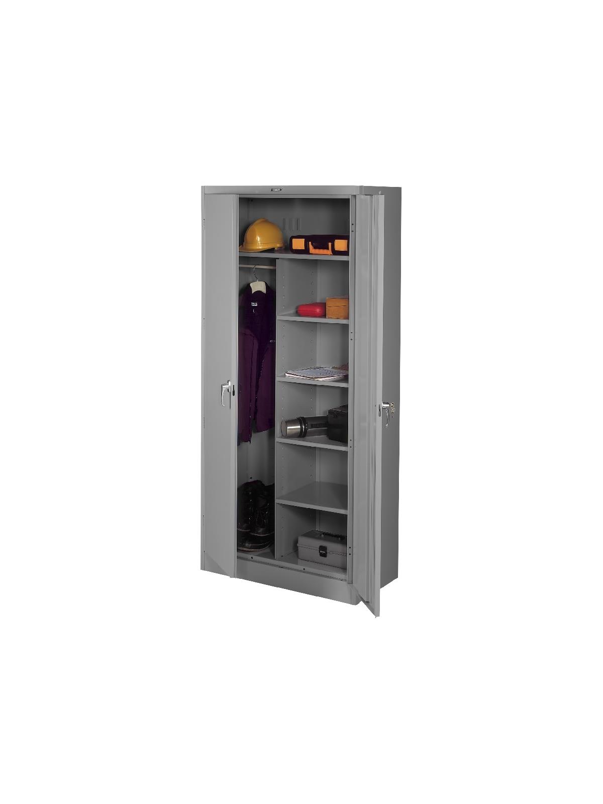 Knuckle hinges on each door insure the integrity of the cabinet and the alignment of the doors. Doors are reinforced for strength and quietness. Handle on right-hand door activates a 3-point system for added security; dummy handle on left-hand door. Shelves are adjustable in 2" increments on built-in shelf tabs. Shelves will hold up to 200 lbs. evenly distributed. Two front leveling glides compensate for uneven floors. Louvered back panel allows air circulation in the cabinet. Available in four models--storage, wardrobe, combination, and counter high cabinets. Available in Black, Champagne/Putty, Sand, Light Gray and Medium Gray. FOB Shipping Point.