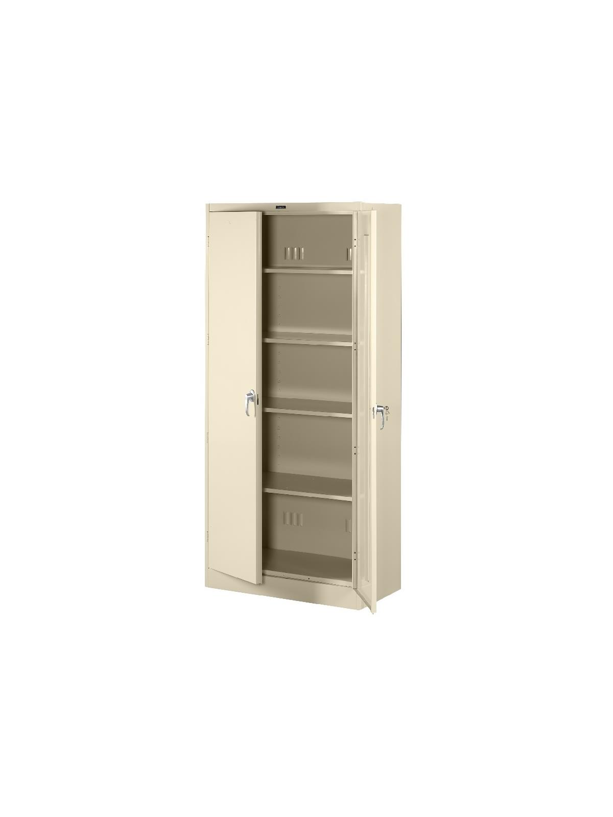 Knuckle hinges on each door insure the integrity of the cabinet and the alignment of the doors. Doors are reinforced for strength and quietness. Handle on right-hand door activates a 3-point system for added security; dummy handle on left-hand door. Shelves are adjustable in 2" increments on built-in shelf tabs. Shelves will hold up to 200 lbs. evenly distributed. Two front leveling glides compensate for uneven floors. Louvered back panel allows air circulation in the cabinet. Available in four models--storage, wardrobe, combination, and counter high cabinets. Available in Black, Champagne/Putty, Sand, Light Gray and Medium Gray. FOB Shipping Point.