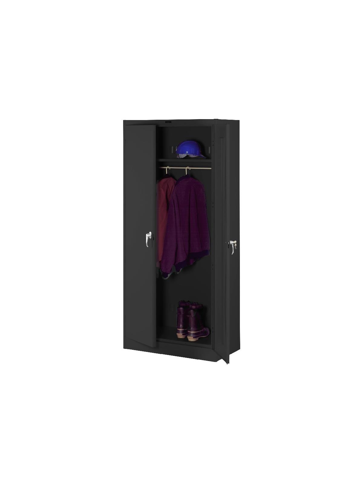 Knuckle hinges on each door insure the integrity of the cabinet and the alignment of the doors. Doors are reinforced for strength and quietness. Handle on right-hand door activates a 3-point system for added security; dummy handle on left-hand door. Shelves are adjustable in 2" increments on built-in shelf tabs. Shelves will hold up to 200 lbs. evenly distributed. Two front leveling glides compensate for uneven floors. Louvered back panel allows air circulation in the cabinet. Available in four models--storage, wardrobe, combination, and counter high cabinets. Available in Black, Champagne/Putty, Sand, Light Gray and Medium Gray. FOB Shipping Point.
