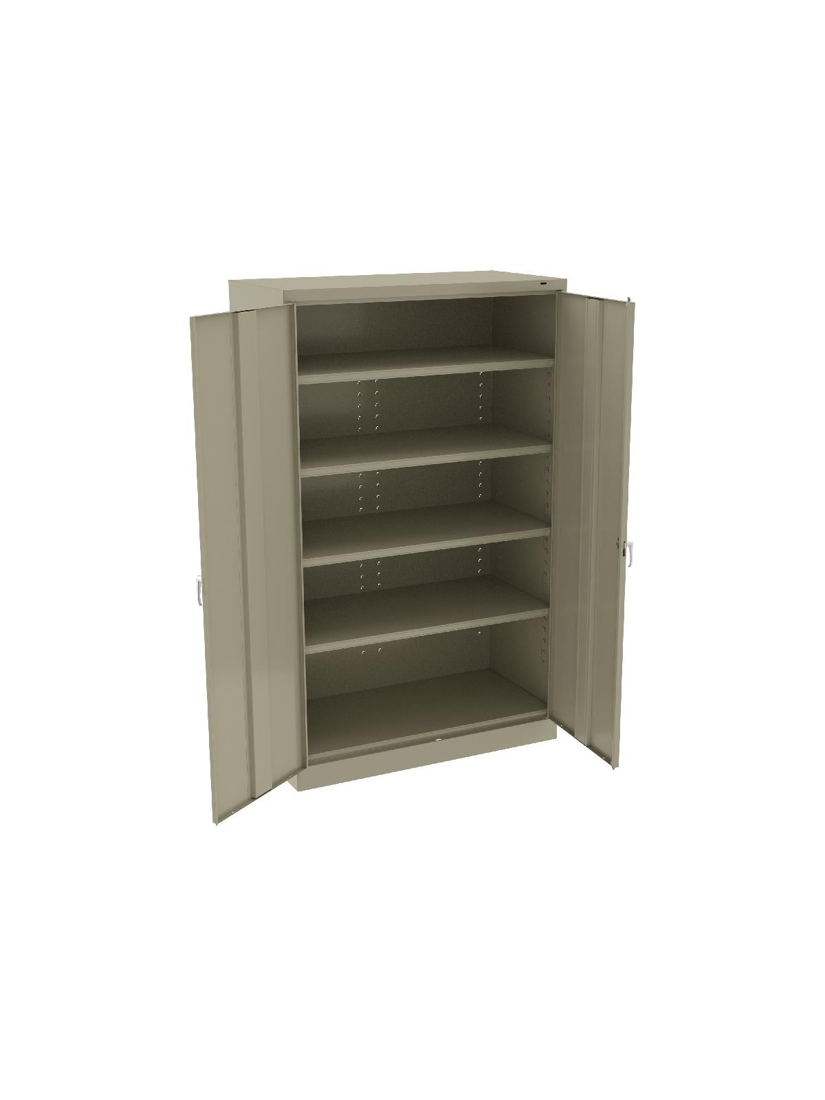 Jumbo size for jumbo storage capacity. Two front leveling glides compensate for uneven floors. Four leaf hinges on each door insure the integrity of the cabinet and the alignment of the doors. Handle on right-hand door activates a three-point locking system for added security -- second handle on left-hand door. Shelves are adjustable in 2" increments on built-in shelf tabs. Shelves hold up to 400 lbs. evenly distributed. Unassembled cabinets ship in 2 cartons. Available in Black, Champagne/Putty, Sand, Light Gray and Medium Gray. FOB Shipping Point.