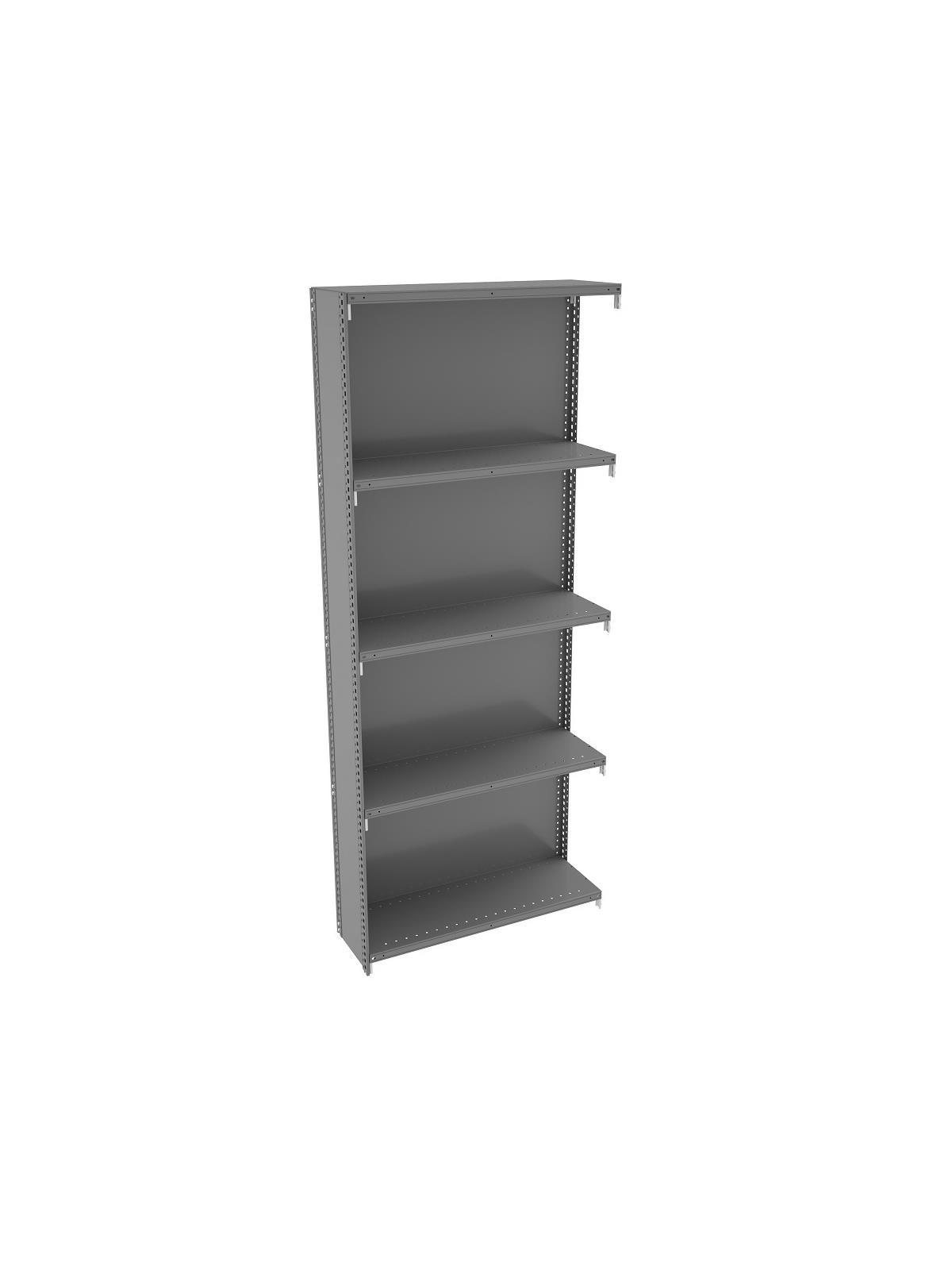 The unique shelf design has deep box-beam formations front and back, fully lapped and welded corners and double-ribbed outside surfaces on the box formation. In addition, the front and rear flange on the box beam is welded every 3". The result is load capacities that range all the way up to 1000 lbs. Shelves can be adjusted quickly and easily in 1" increments to make maximum use of vertical space. Five shelves including top and bottom shelves. Choose from open or closed units. Additional shelves are available as well as adjustable shelf dividers, shelf boxes and doors. Starter unit can be used individually or combined with adder units to form a row of shelving. Shipped unassembled. Medium gray finish. FOB Shipping Point.
