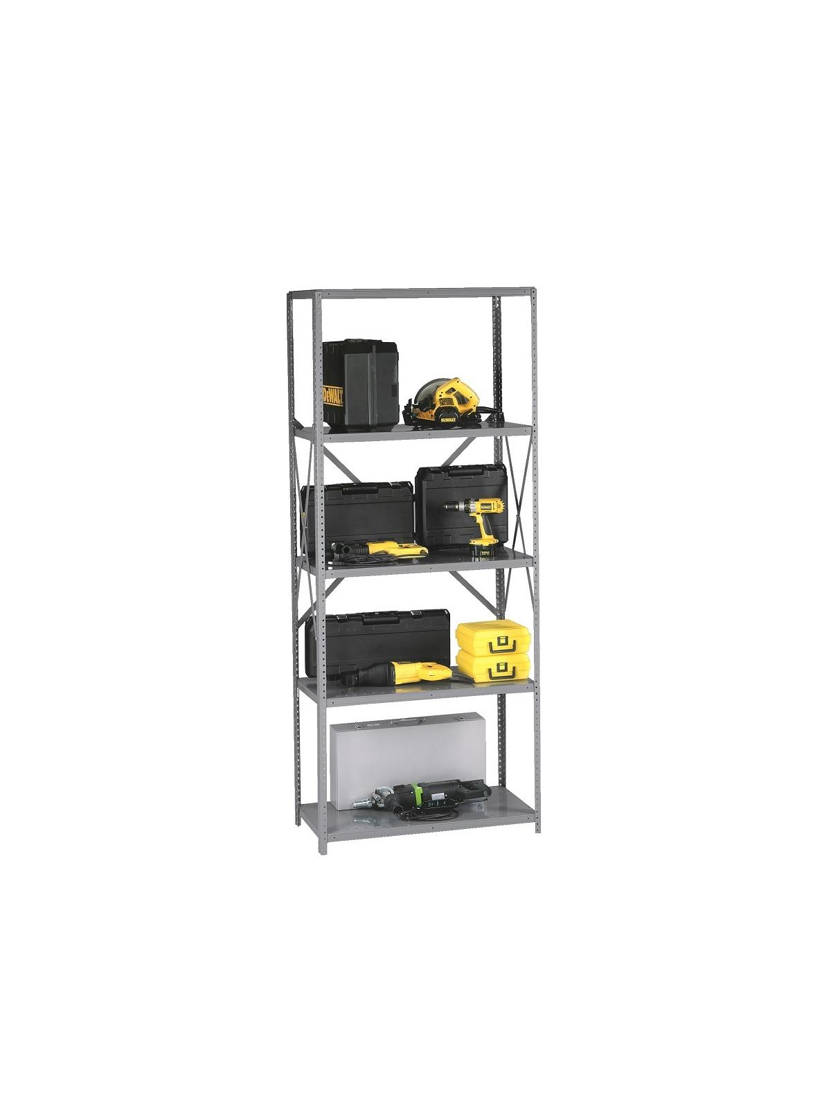 The unique shelf design has deep box-beam formations front and back, fully lapped and welded corners and double-ribbed outside surfaces on the box formation. In addition, the front and rear flange on the box beam is welded every 3". The result is load capacities that range all the way up to 1000 lbs. Shelves can be adjusted quickly and easily in 1" increments to make maximum use of vertical space. Five shelves including top and bottom shelves. Choose from open or closed units. Additional shelves are available as well as adjustable shelf dividers, shelf boxes and doors. Starter unit can be used individually or combined with adder units to form a row of shelving. Shipped unassembled. Medium gray finish. FOB Shipping Point.