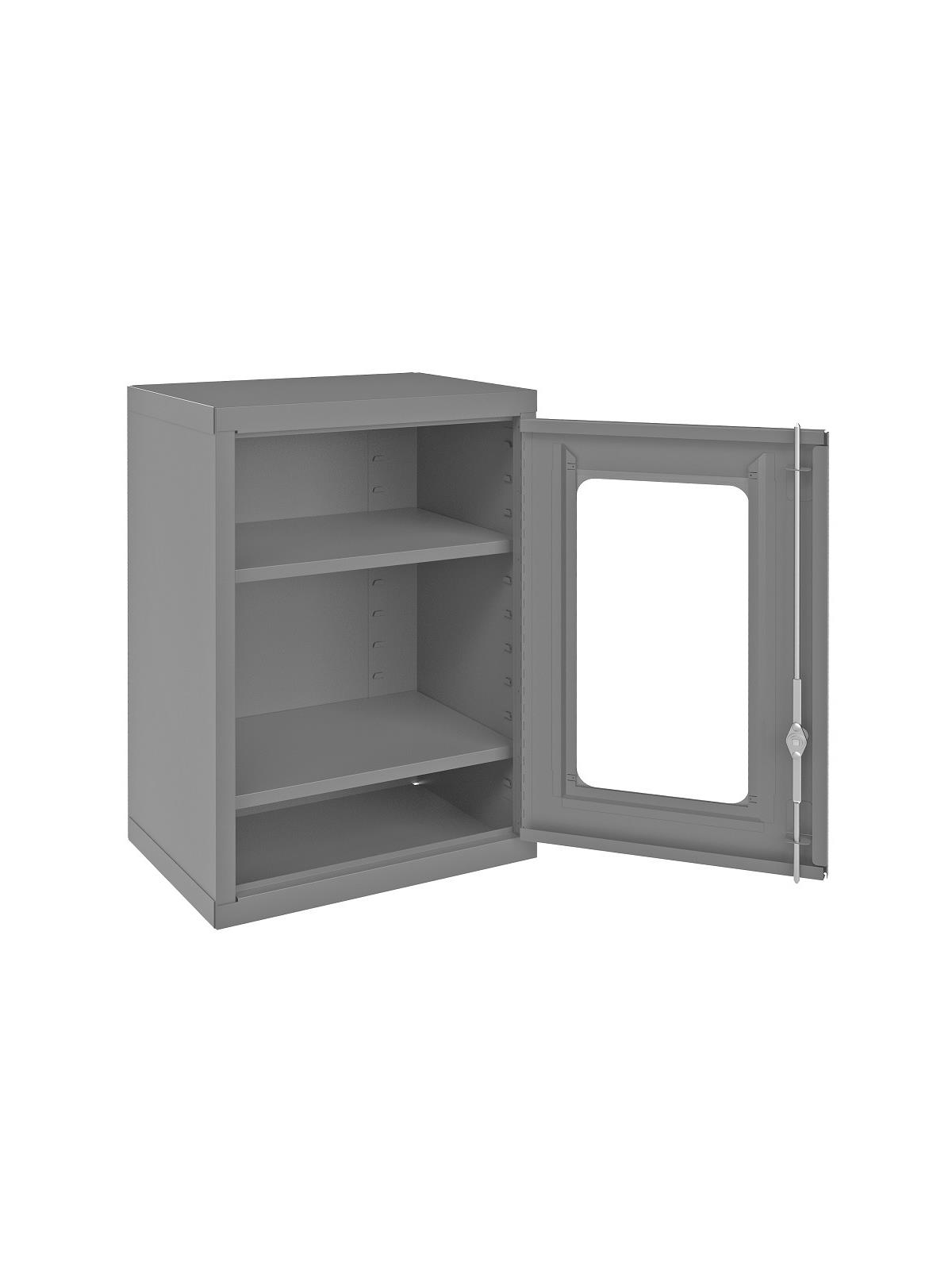 18 gauge, all welded, steel construction. Includes mounting hardware. Includes 2 adjustable shelves that adjust on 2" centers. Locking system with keys included. Keyhole slots in the back of the unit for wall mounting. Ships fully assembled. Gray, gloss powder coat finish. FOB Shipping Point.
