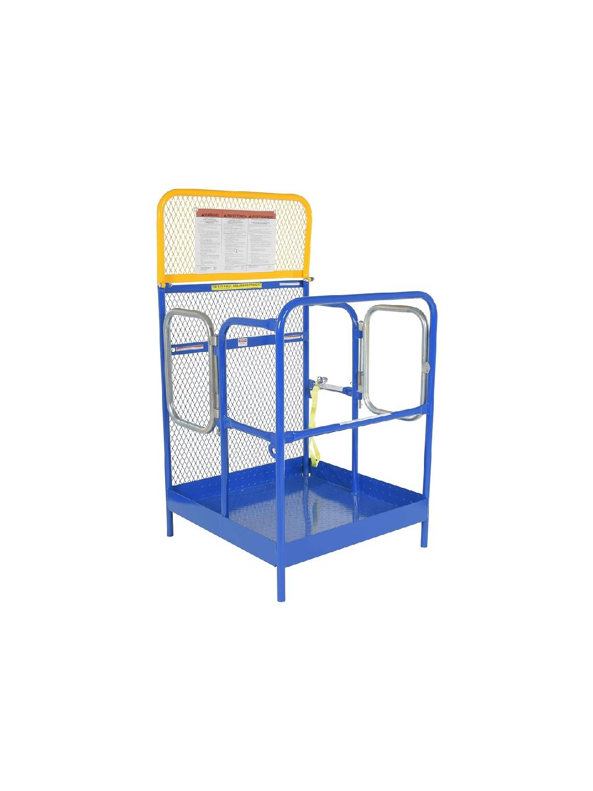 Convenient fork truck work platforms quickly and safely raise maintenance personnel where they are needed. Attaches to fork lift truck by inserting forks into fork pockets and securing platform to fork truck. Fork locks secure platform to forks and a 36" long safety restraint which hook attaches platform to fork truck. 42" high handrail with 21" high mid-rail on three sides. 60" high expanded metal backing on forth side (84" high backing to meet California OSHA available, call for details). Includes diamond plate platform. The usable fork pockets on single and dual side door entry are 7-3/4"W x 3-7/8"H in rear and 7-3/4"W x 1-7/8"H in front. The usable fork pockets on fold down work platform measure 7-7/8"W x 3-3/8"H on 27-3/4" centers. Steel construction with baked-in powder-coated toughness. FOB Shipping Point.